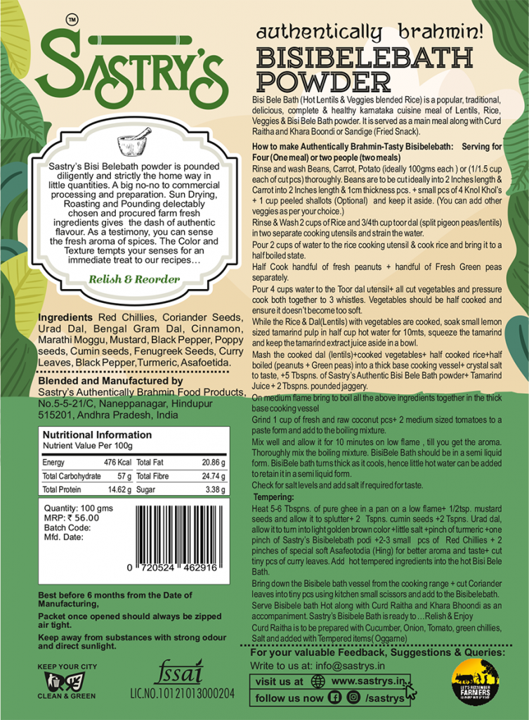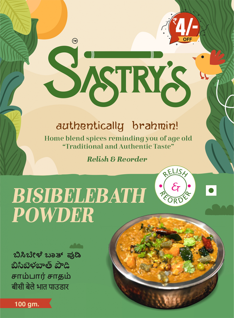 In StockSastry’s BisiBelebath Pudi is pounded diligently and strictly the home way in little quantities. A big no-no to commercial processing and preparation. Sun Drying, Roasting and Pounding delectably chosen and procured farm fresh ingredients gives the dash of authentic flavour. As a testimony, you can sense the fresh aroma of spices. The Color and Texture tempts your senses for an immediate treat to our recipes…